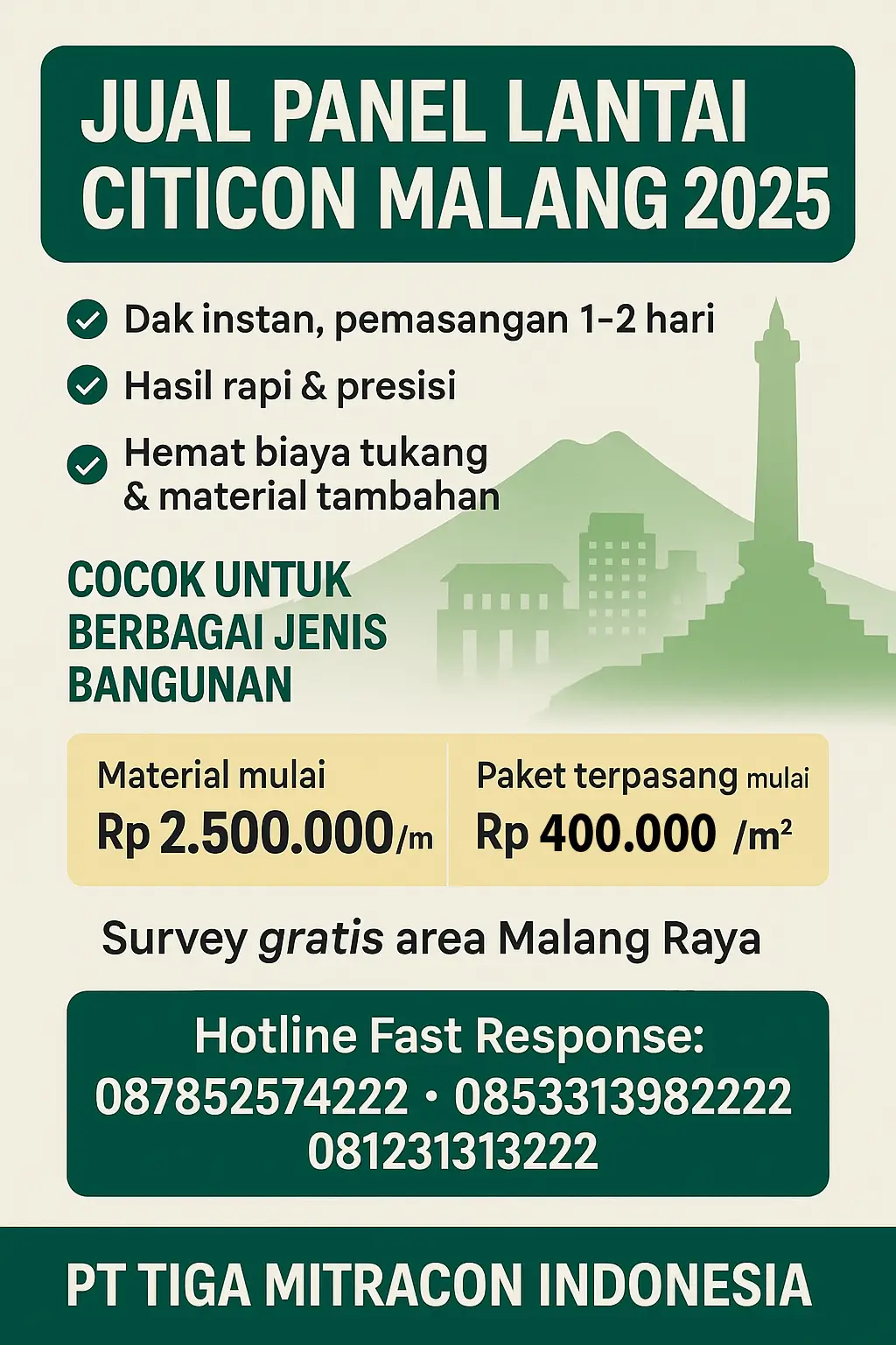 Segera wujudkan bangunan impian Anda dengan Panel Lantai Citicon Malang 2026 dari PT Tiga Mitracon Indonesia.